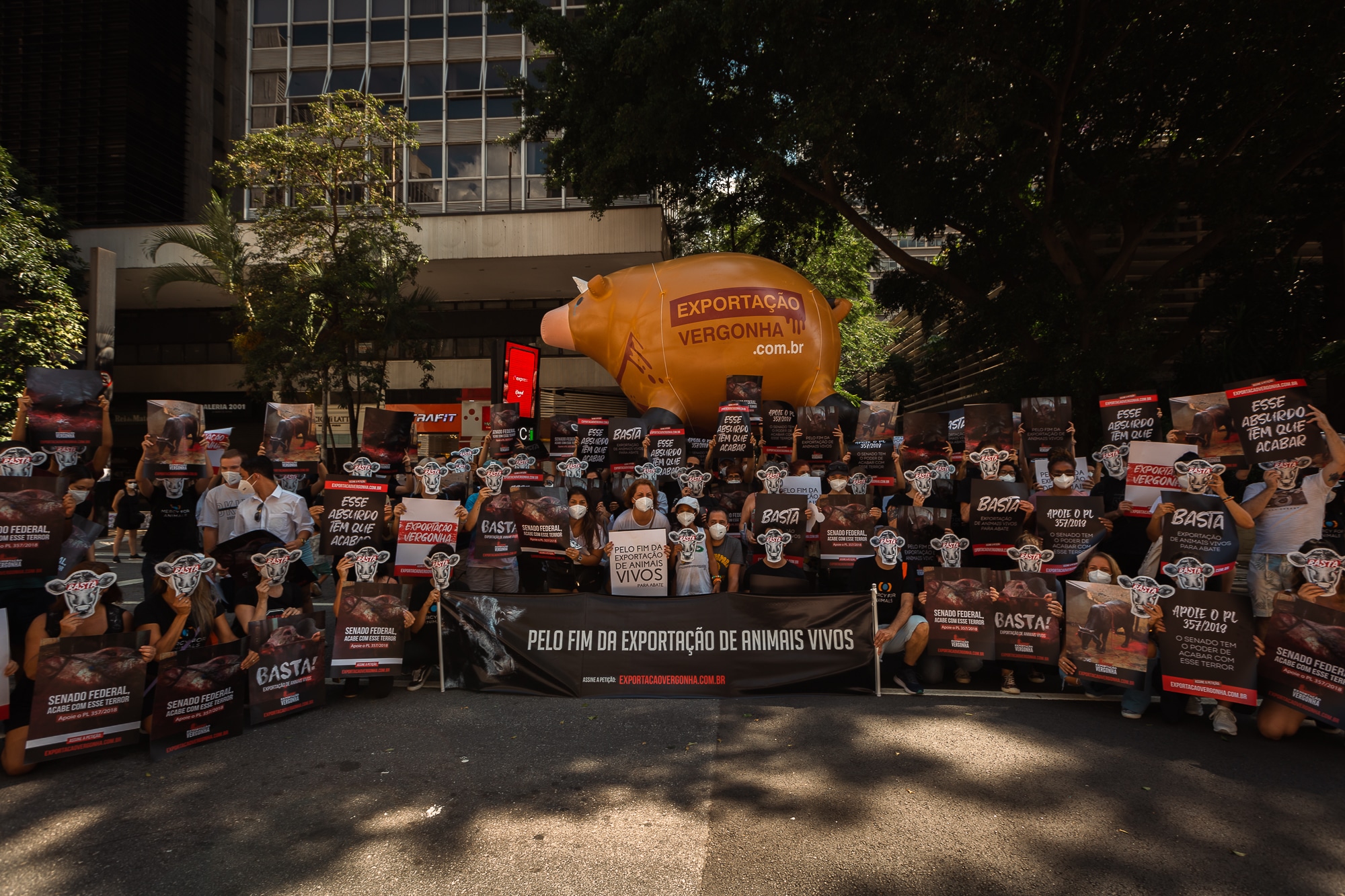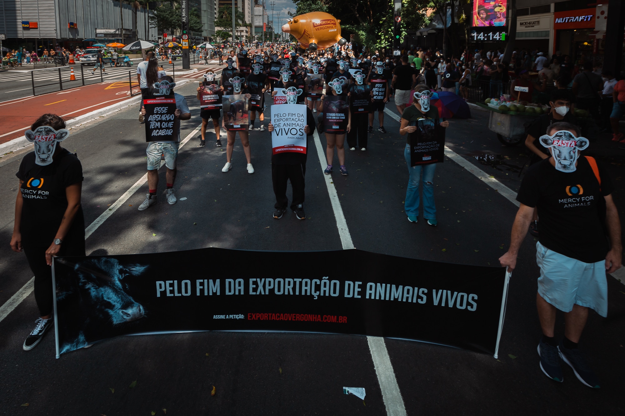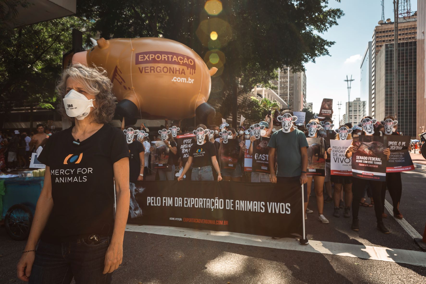 Mobilização organizada pela Mercy For Animals defendeu aprovação de lei no Congresso acabando com a atividade e também chamou atenção para embarque em andamento, no Pará, envolvendo o maior navio de transporte de animais vivos do mundo