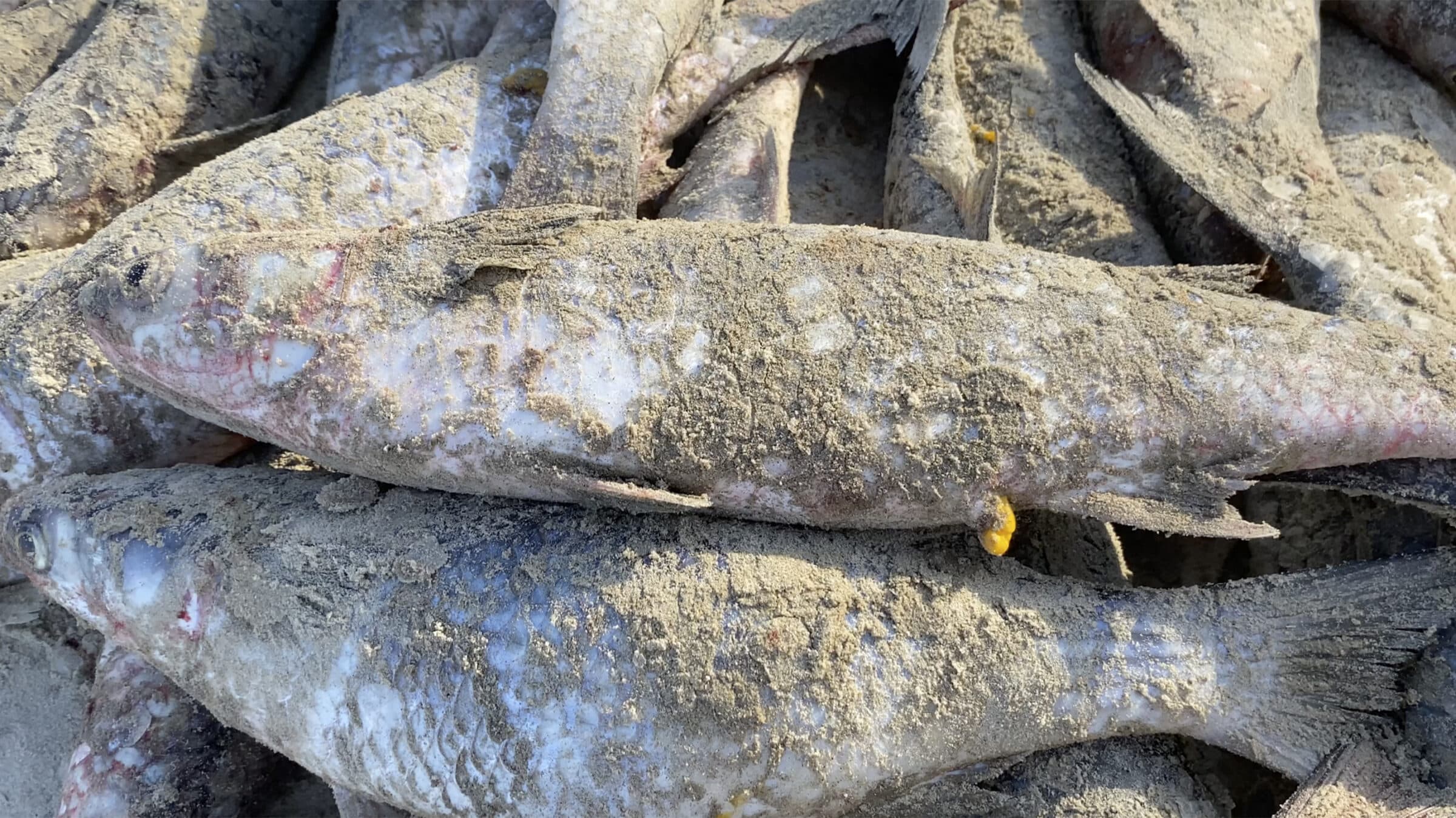 A investigação também revela milhares de tainhas sendo arrastadas por redes para fora do mar e deixadas na areia para morrer lentamente asfixiadas. Nas imagens, é possível ver os peixes agonizando pela falta de oxigênio enquanto se debatiam e lutavam por suas vidas até perderem a consciência.